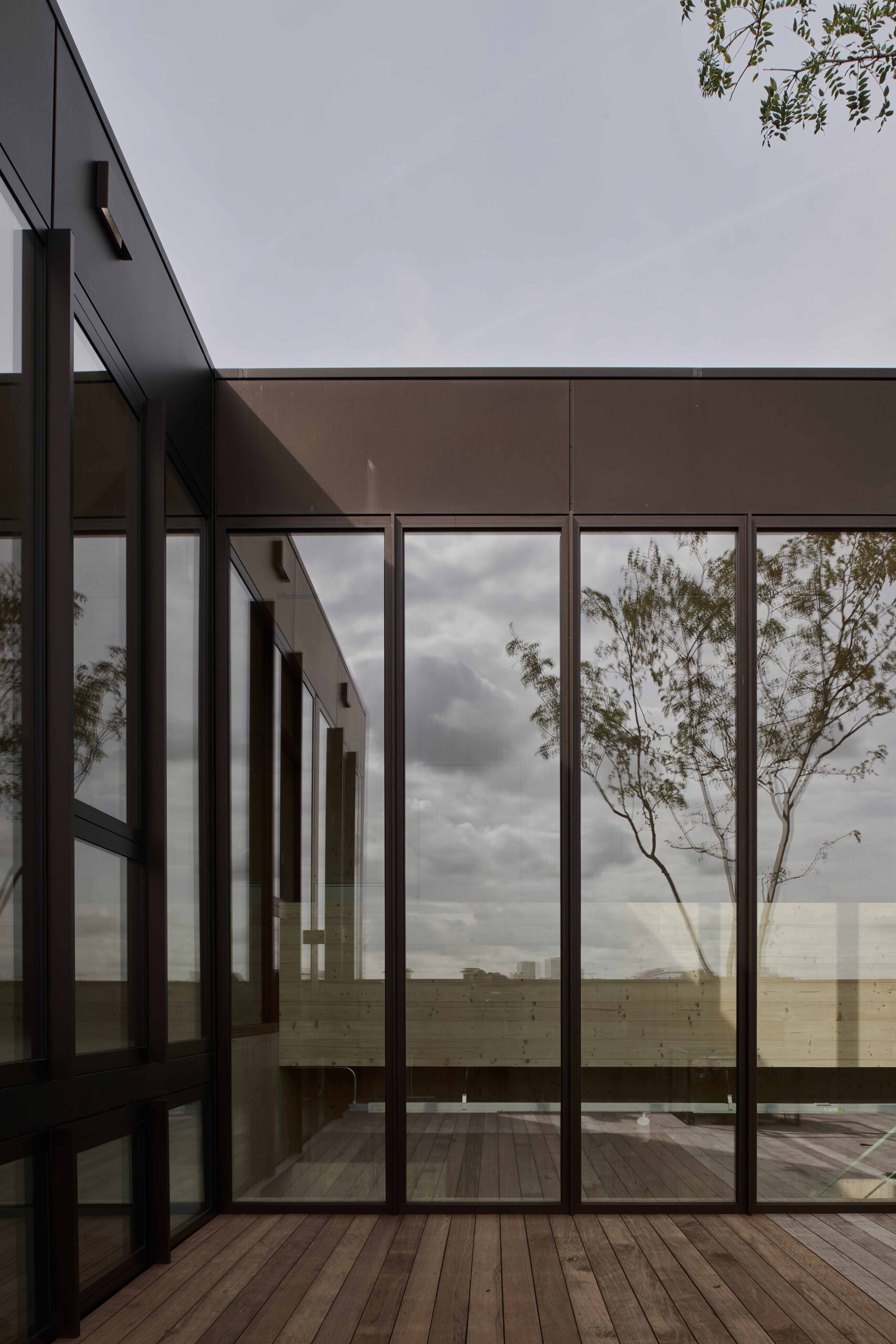 Door de woning open te draaien naar het zuiden ontstaat een maximale zichtlijn over het open veld, terwijl het zonlicht diep het huis binnendringt. De dubbelhoge woonkamer vergroot het ruimtelijke gevoel en zicht op de tuin. Keuken en woonkamer vloeien in elkaar over, verbonden maar apart. De kinderkamers liggen op het noorden, de dubbelhoge master-bedroom op het oosten met ochtendzon. De leefruimte is volledig gericht op het zuiden en staat in directe verbinding met het grootste deel van de tuin, waardoor binnen en buiten naadloos in elkaar overlopen.